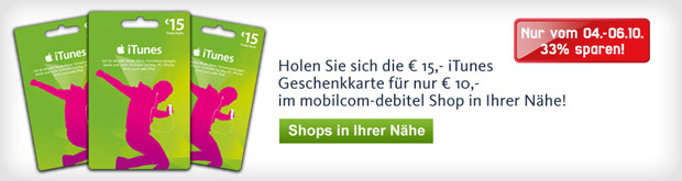 Von heute bis einschließlich Mittwoche bietet der Mobilfunkanbieter Mobilcom-Debitel preisreduzierte iTunes-Karten in seinen Deutschland-Filialen an. Wer an einem der Partner-Shops vorbeikommt kann sich Karten im Wert von 15€ für 10€ mitnehmen und spart so 33%. Der Wert der Gutscheinkarten wird auf das iTunes-Guthaben verbucht, anschließend kann völlig frei im Musik-, Film- oder AppStore darüber verfügt werden.