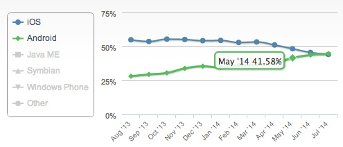 Zeiten, die sich gerade ihrem Ende zuneigen. Im Juli ist die weltweit gemessene iOS-Nutzung erstmals auf 44,19% gefallen. Das Android-Lager konnte sich mit 44,62% den ersten Platz in der Statistik-Kategorie „usage“ sichern. Noch vor einem Jahr lag der Usage-Marktanteil Androids bei 25,28%, iPhone und iPad dominierten mit 58,26%.