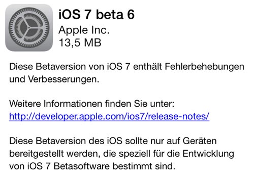 Früher als erwartet bietet Apple für Entwickler nun die sechste Vorabversion für iOS 7 zum Download an, Berichten aus den USA zufolge sollte das nächste Update ja erst nächste Woche veröffentlicht werden. Die Dateigröße der Aktualisierung ist mit 13,5 MB auf dem iPhone ausgesprochen klein, offenbar werden lediglich letzte Fehler behoben, unter anderem ein Problem mit der Musikwiedergabe über iTunes in the Cloud.