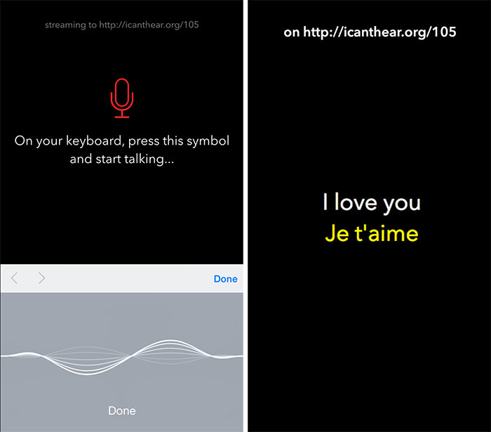Mit der kostenlosen iOS-Anwendung icanthear versucht der Entwickler Etienne Adriaenssen die Kommunikation mit tauben Menschen zu optimieren. Anstatt auf handgeschriebene Notizen und kleine Displays ausweichen zu müssen, beamt icanthear eure Sätze auf einen beliebigen Monitor. Einzige Voraussetzungen: Die kostenlose iPhone App und eine zweites Gerät mit Internet-Zugang.