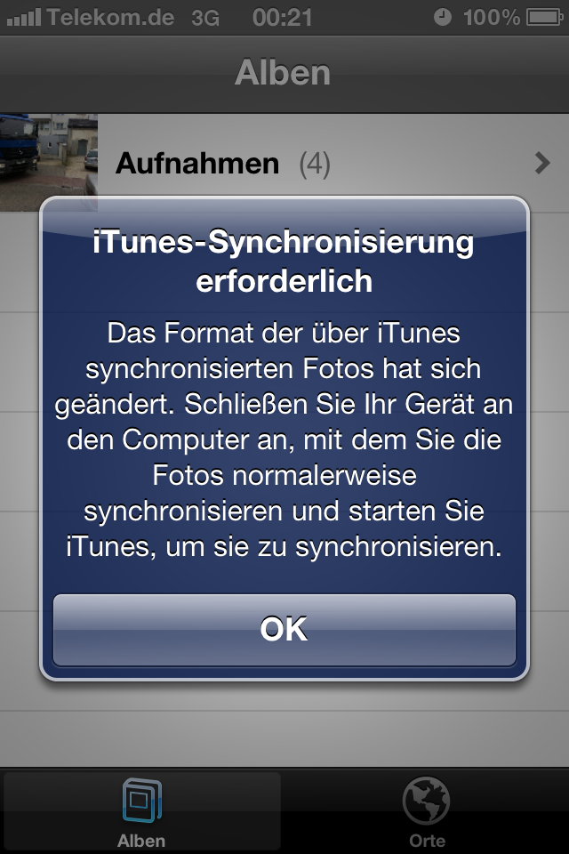 - Nach dem Update, macht das iOS 4.3 unter Umständen mit folgender Warnmeldung auf sich aufmerksam: „iTunes Synchronisation erforderlich – Das Format der über iTunes synchronisierten Fotos hast sich geändert…“