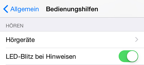 Einschalten lässt sich die Option in den Bedienungshilfen des iPhones und versteckt sich im Menu: Einstellungen > Allgemein > Bedienungshilfen > LED-Blitz bei Hinweisen.