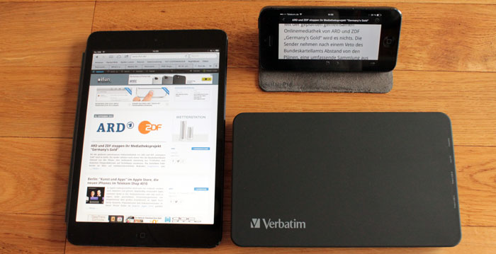 Mit dem MediaShare etwa, bietet Verbatim eine drahtlose Kombi aus Akku und Speicherbaustein für iPhone und iPad an, der SD-Karten mit Kapazitäten von bis zu 64 GB über ein eigenes W-Lan Modul an Apples Mobilgeräte weiterreicht und über die im App Store erhältliche MediaShare-Applikation (AppStore-Link) bedient werden kann. Und inzwischen hat die Mitsubishi-Tochter auch externe USB-Akkus für iPhone und iPad im Programm.