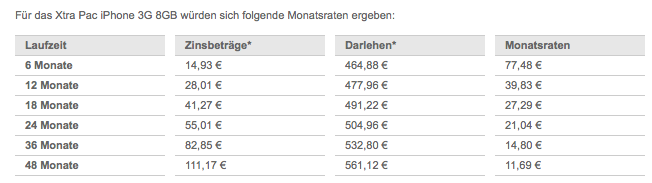 T-Mobiles Online-Auftritt macht mit zwei kleine Neuerungen auf sich aufmerksam. Zum einen lässt sich die Prepaid-Ausgabe des iPhone 3Gs, das Apple iPhone Xtra Pac, nun auch finanzieren. Mit Laufzeiten zwischen sechs und 48 Monaten, kann die 8GB-Version der zweiten iPhone-Generation für eine monatliche Raten zwischen 12€ und 77€ erworben werden. Je nach Laufzeit liegt der Endpreis des iPhones so zwischen 464€ und 561€.