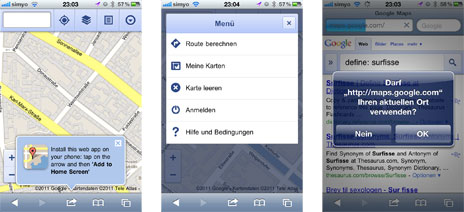Immerhin: Google hat seine Web-Version der Karten Anwendung nun überarbeitet und stellt die auf maps.google.com abgelegten Geo-Daten allen Smartphone-Nutzern zur Verfügung. Die Safari-optimierte Web-Anwendung zeigt nun den eigenen Standort, lässt sich zur umgebungsabhängigen Suche nutzen, ist mit kleinen Icons für Geschäfte, Bahnhöfe und Sehenswürdigkeiten versehen und bietet sowohl die Routenberechnung an, als auch die bekannten Darstellungsoptionen für Ebenen wie „satellite, transit, traffic und biking“.